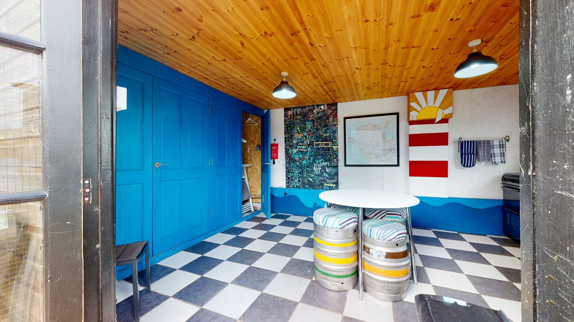 - External field kitchen equipped with pots and pans, cooker, microwave, freezer, kettle and toaster